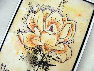 I loved this background as it's not often I can get 'subtle' with Brushos as the colours are so intense. I didn't want to cover it up with too much colouring of the image so I just did some shading with Polychromos pencils in specific areas and was so happy with the result. I also added a light shadowing around the image to give a little dimension then stamped the Chocolate Baroque sentiment and inked with black around the edges. Matting and layering to complete the card.